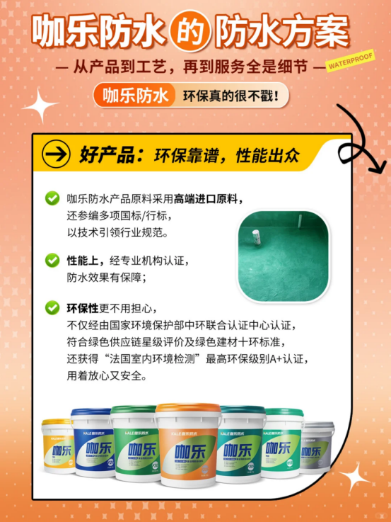 此外,咖乐防水陆续通过ISO质量管理体系、中国环境标志十环、法国A+等多项认证,是其环保品质的有力背书。在绿色建材趋势下,咖乐持续以“环保性能”作为产品研发的核心维度,呼应了消费者对居住健康日益增长的需求。